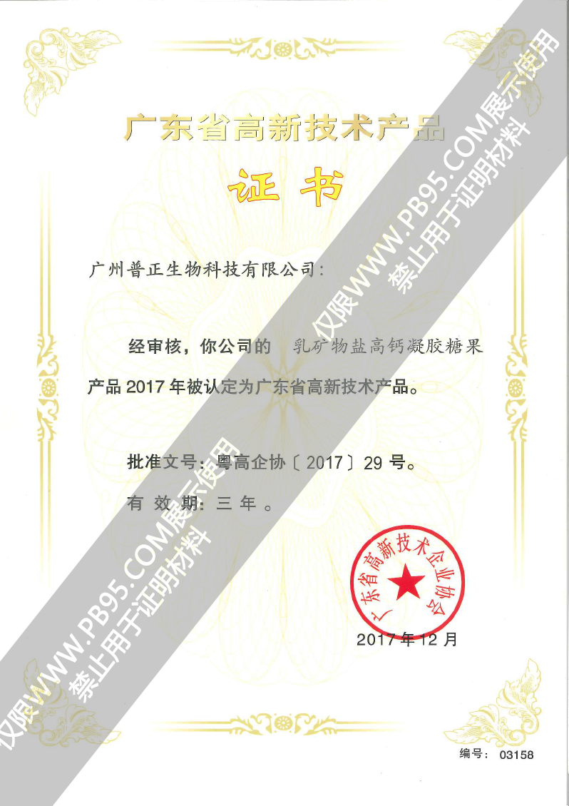 海藻鈣高鈣凝膠糖果——高新技術(shù)產(chǎn)品證書