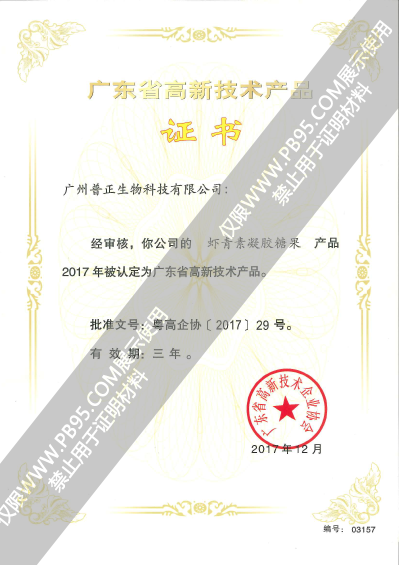 蝦青素凝膠糖果——17年高新技術(shù)產(chǎn)品證書