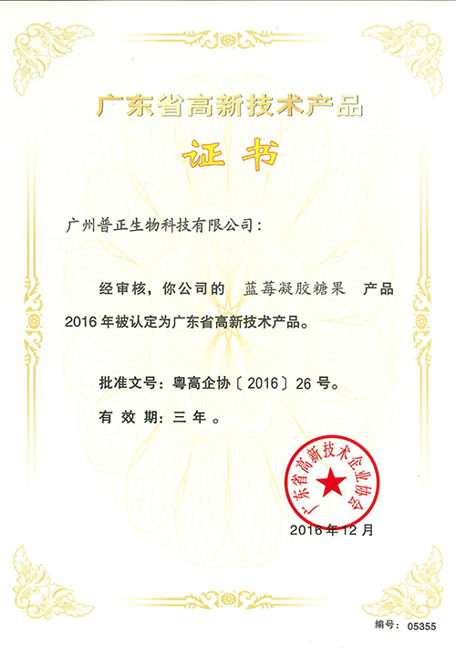 藍(lán)莓凝膠糖果——高新技術(shù)產(chǎn)品證書